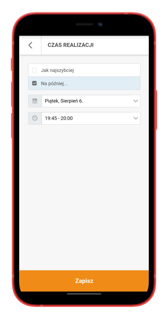 W aplikacji należy wybrać czas realizacji, następnie zaznaczyć opcję na później i wybrać odpowiednią datę (tak, jak na załączonym obrazku). To wszystko co musisz zrobić w naszej aplikacji, by zamówić sushi z wyprzedzeniem!