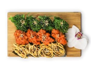 tofu w togarashi, oshinko, ogórek, sałatka wakame, dressing wasabi, sałata,