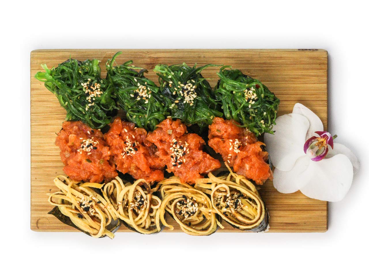 kani kama w tempurze, oshinko, goma wakame, serek, sałata